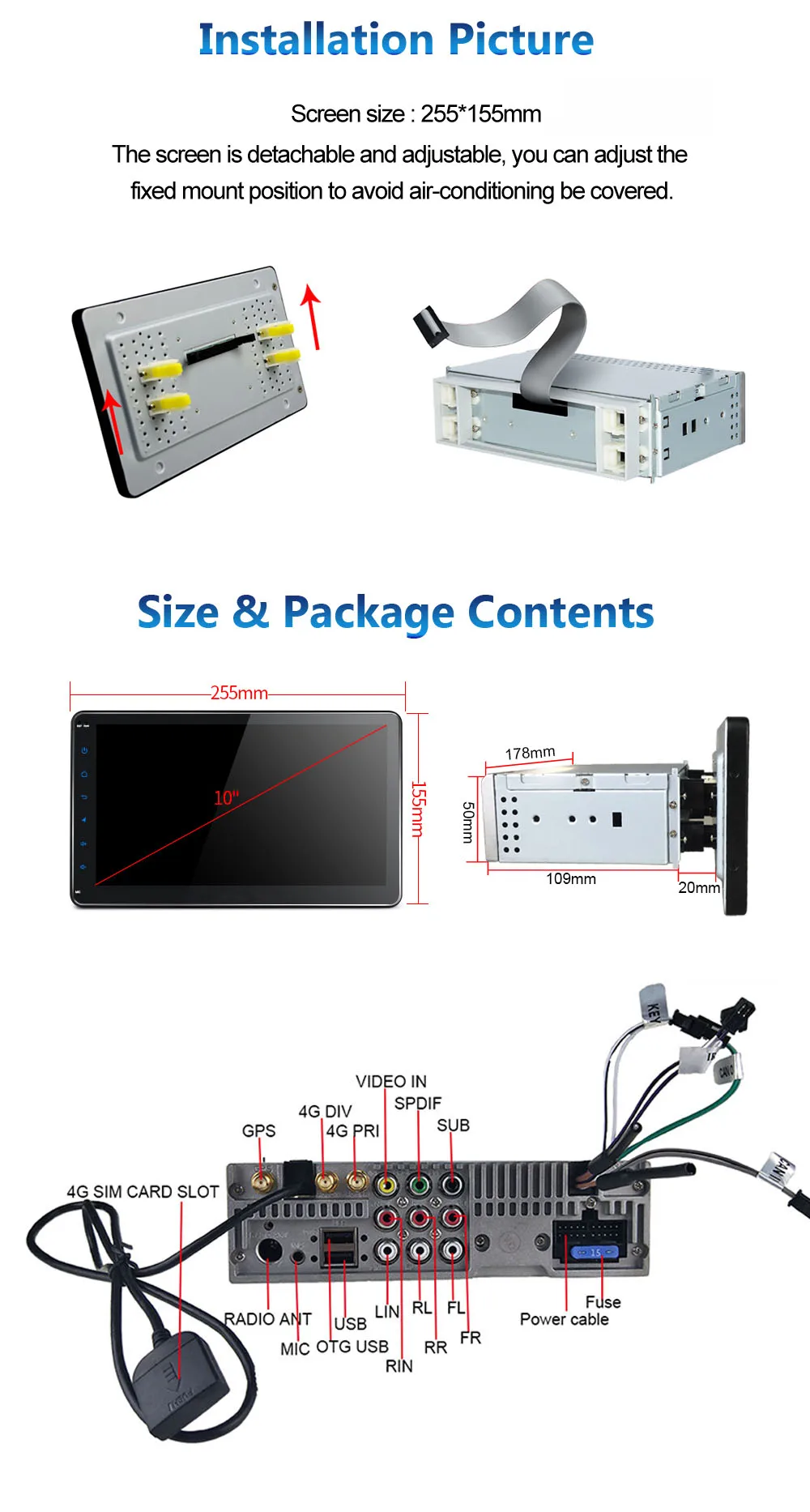 1. Сенсорный экран Экран Размеры: 10,1'' 2. Напряжение: 12 В постоянного тока 3. Сопротивление динамика: 4 Ом 4. Максимальная мощность: 4*50 Вт 5. ОЗУ: LPDDR4 4 Гб 6. Вспышка: EMMC 64 ГБ 7. Разрешение: дисплей 1024x600 8. Процессор: SC9853 Восьмиядерный 1,8 ГГц