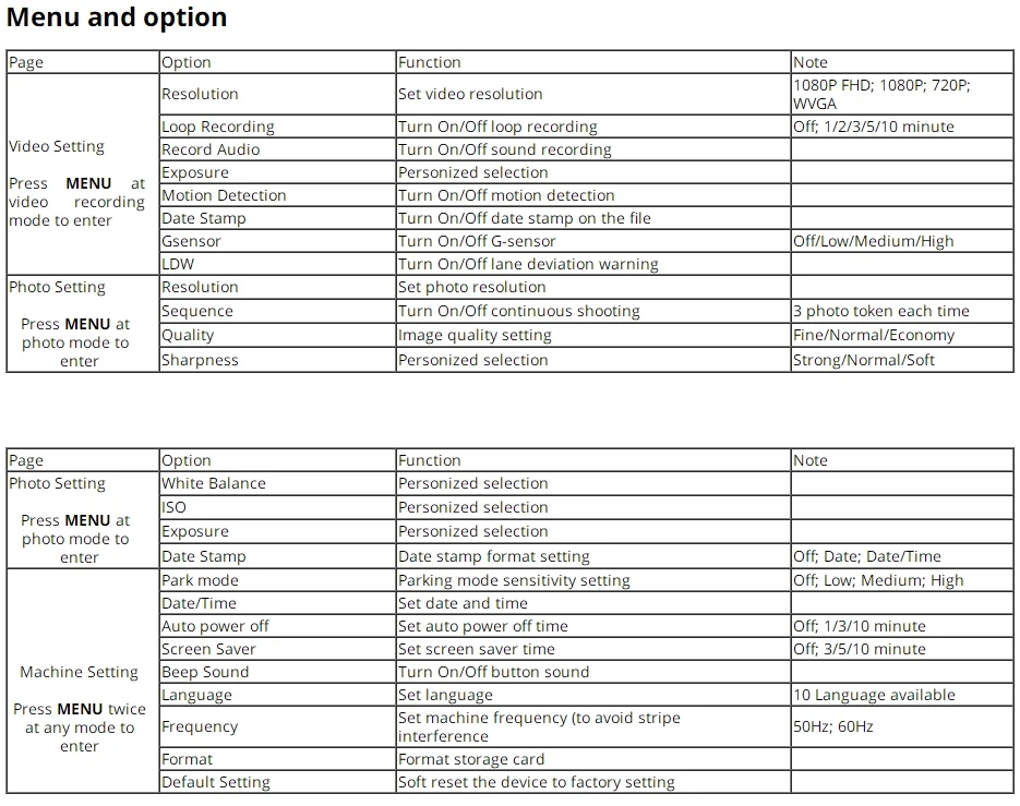 В: не удается включить? О: сначала проверьте, подключено ли устройство к автомобильному зарядному устройству. Если проблема все еще существует, вы можете попробовать сбросить устройство. В: запись остановлена без причины? Не циклическая запись? О: Пожалуйста, проверьте, используете ли вы высокоскоростную карту памяти. Рекомендуется использовать класс 10 или выше. Не циклическая запись может быть слишком высокой из-за чувствительности g-датчика и сохранения слишком большого количества заблокированных файлов, которые занимают слишком много места памяти. Вы можете попробовать отформатировать карту и настроить уровень чувствительности g-датчика. В: изображение размыто? О: пожалуйста, держите линзу в чистоте, попытайтесь очистить поверхность мягким полотенцем и тканью В: качество изображения не является стабильным? О: возможно, из-за изменения условий освещения качество изображения сильно зависит от состояния света. В: полосы помех? О: может быть из-за состояния света неправильной частотой, пожалуйста, попробуйте использовать его при различных условиях освещения или при дневном освещении. В: сломается? О: Пожалуйста, попробуйте сбросить устройство. В: мешает автомобильному радио? О: как правило, из-за автомобильной электрической валюты, здесь есть способы помочь решить проблему: Попробуйте изменить на другое зарядное устройство; изменить частоту устройства; купить анти-помехи зарядное устройство с алюминиевой фольгой; подключите устройство к автомобильному аккумулятору. Если все вышеуказанные решения не удалось, пожалуйста, свяжитесь с нашей службой поддержки для получения дополнительной помощи.