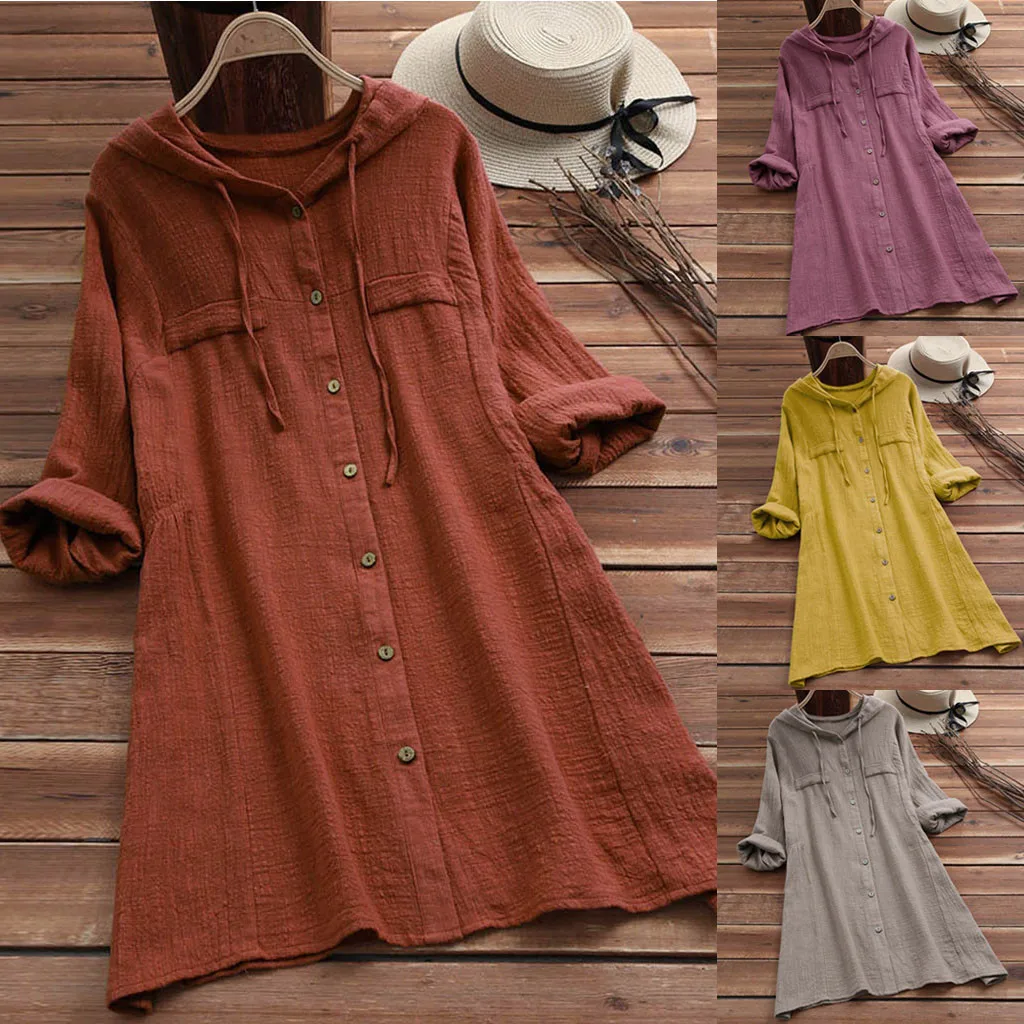 Женская Повседневная Свободная хлопковая Футболка с карманами и капюшоном, на пуговицах, размера плюс