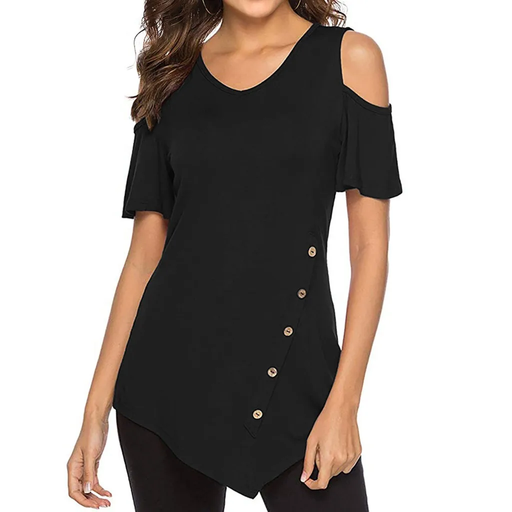 Women Casual Round Neck Blouse Cold Shoulder Button Shirt Short Sleeve Tops
