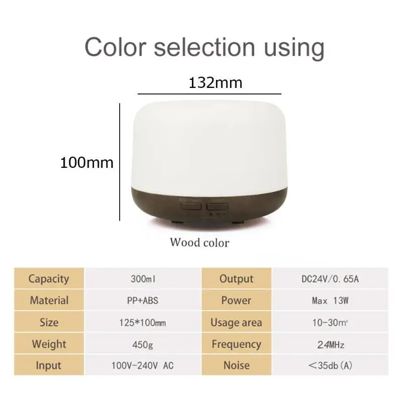 | 100-240V 300ml Ultrasonic 7 Color LED Lamp Flashlight Timing Air Humidifier Aromatherapy Essential Oil Mist Aroma Diffuser for Home Office Descriptions: This aroma diffuser is specially developed and designed in terms of material selection, structural design, core atomized film, electronic circuit and elements and so on.It can atomize aroma and water molecule into nano level and diffuse them all around. According to the different components of essential oils, they can play different roles, purify the air and relax the mind. For example, rosemary can relieve fatigue, lemon lemon can whiten oil control, geranium can prevent colds and so on. Features: ABS + PP + PC material, oil, water and corrosion resistant; Colorful gradient lights, can be used as night light; The humidifying time can be adjusted. 10s/2h/3h timing indicates,ON is a long time spray indication, and MIST is the adjustment key. The gear can be adjusted. There are high-speed spray and low-speed spray, two kinds of fog volume, according to the need for adjustment. This section of aromatherapy machine, supporting the English instructions, colorful lights flashing have detailed instructions, to help you operate this fragrant machine! Specifications: Product material: ABS + PP + PC + Ultrasonic core Product size: 132*132*100mm/5.2*5.2*3.94" Product weight: 300g Water tank capacity: 300ml Spray volume: 30-50ML/H Input: AC100-240V; 50/ 60HzOutput: 24V; 500mA Power supply mode: adapter power supply Plug Specification: EU/US/AU/UK Color: Ivory/Light Brown/White/Dark Brown Suitable space size: 25㎡ Application occasions: home, hotels, restaurants, kitchens, banks and other placesNote: For more specific use instructions, specifications and attentions, please read the user manual in detail. Due to the different monitor and light effect, the actual color of the item might be slightly different from the color showed on the pictures. Thank you! 1 X Aroma Diffuser 1 X Power Adapter 1 X Measure Cup 1 X User Manual |