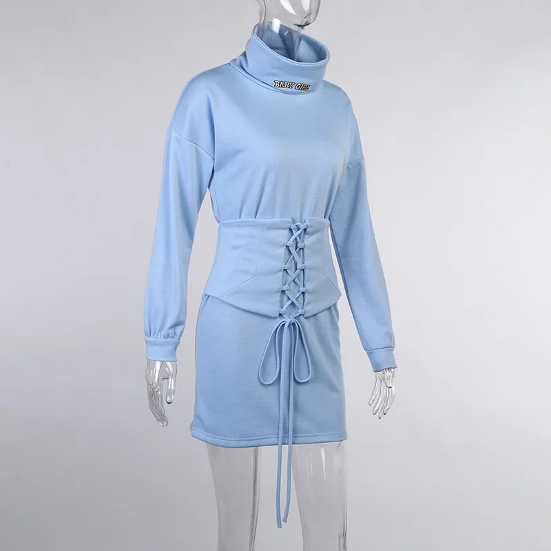 Платья зимняя женская обувь 2020 определено; Соблазнительные повседневные туфли; Элегантные платья пояс с высоким, плотно облегающим шею воротником с длинными рукавами обтягивающее мини-платье Vestidos Jurk платье (по заниженной относительно фактической цене 12,5 $)