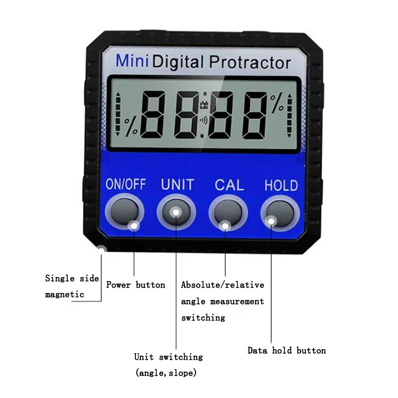 360 градусов без мертвого угла измерения, дно поставляется с сильным магнитным, может быть прикреплен к объекту, который будет измерен, для того, чтобы облегчить измерение Когда прибор помещается вверх дном, дисплей автоматически перевернет и отобразит измерения 360 градусов для удобного просмотра данных. 4 единицы и 2 режима измерения, свободно переключать Полнофункциональный, может быть применен для производства машин, ремонта автомобилей, медицинской промышленности, обработки древесины, Тестирования Инструментов, украшения дома и других отраслей промышленности Спецификация: Диапазон измерения: 4*90 ° Разрешение: 0,1 ° Рабочая температура: 0-40 °C Относительная влажность: 40-80% относительной влажности Питание: 3*3 в кнопочный аккумулятор (не входит в комплект)