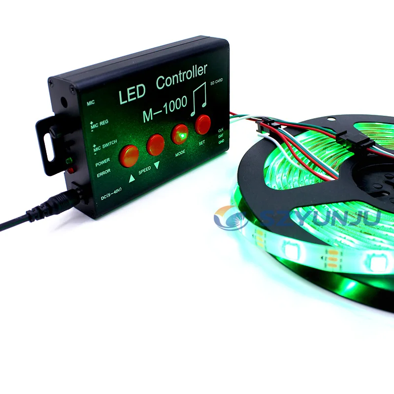 Особенности системы:1, поддержка управления музыкой, световые эффекты могут быть выполнены с ритмом музыки.2. Поддержка голосового и неголосового управления.3. Поддержка голосового управления.4. После окончания музыки время зазора затемнено.5, 32 - 65536 Серая шкала управления, программное обеспечение гамма коррекции обработки.6. Поддерживает различные точки, линии, внешний светильник, поддерживает различные правила, специальную обработку.7, выход контроллера с одним портом, максимум может быть 2048 пикселей.8. Автономное управление, содержимое воспроизведения хранится на sd-карте.9. M-1000 может хранить до 16 файлов и копировать несколько файлов на sd-карту в свою очередь.10. Эффекты, хранящиеся на sd-карте, должны быть названы: XX_00.BIN, XX_01.BIN, XX_02.BIN.11. Совместим с одной и двойной линией ICs. При подключении однолинейных IC ламп нет необходимости подключать CLK к часовой линии.Примечание: 1. Когда порт M-1000 загружен 512 лампами, скорость воспроизведения может достигать 30 кадров/сек. Когда порт загружен более чем 512 огнями, частота кадра будет автоматически уменьшаться по мере увеличения количества огней.