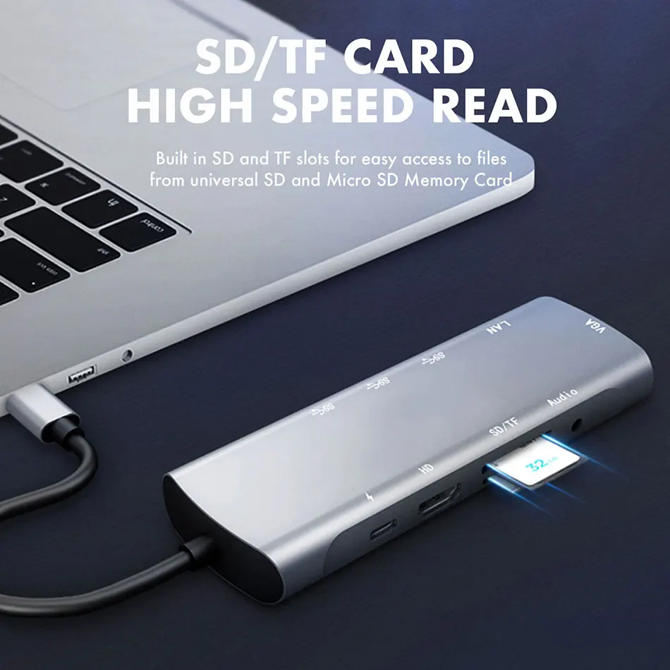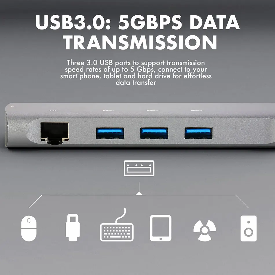 【Надежная передача данных 】Три порта USB 3,0 для поддержки скорости передачи данных до 5 Гбит/с, подключение к смартфону, планшету и жесткому диску для легкой передачи данных. Встроенные слоты SD и TF для легкого доступа к файлам с универсальной карты памяти SD и Micro SD; Поддержка чтения 2 карт одновременно. Порт Ethernet 1000 Мбит/с обеспечивает более стабильное и быстрое проводное подключение к сети.