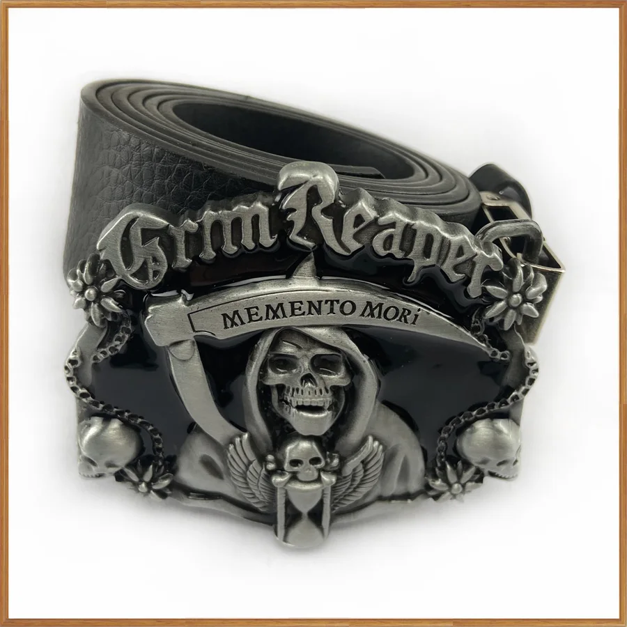 Product description: Grim reaper super hero belt buckle with pewter finish
