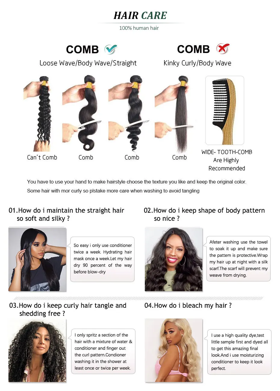Материал волос: лучший выбор необработанных натуральных человеческих волос Плотность: 150% роскошно полная и мягкая Размер шапки: средний размер Пробор парика: боковой пробор/средний пробор (пожалуйста, оставьте комментарий при размещении заказа) Волосяного покрова: предварительно вырезанные Узлы: двойные отбеленные узлы Цвет волос: 613 цветов Цвет кружева: Средний коричневый Срок службы волос: не запутывается, не линяет, низкое содержание, 12-24 месяцев жизни при надлежащем уходе Время доставки: от 3 до 7 дней по всему миру Бесплатная доставка