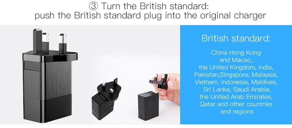 ③ Включите Британский стандарт: вставьте штекер британского стандарта в оригинальное зарядное устройство Британский стандарт: Китай Гонконг, и Макао, Великобритания, Индия, Пакистан, Сингапур, Малайзия, Вьетнам, Индонезия. Малайзийские острова, Шри-Ланка, саудовская арабия, Объединенные Арабские Эмираты, Катар и другие страны и регионы