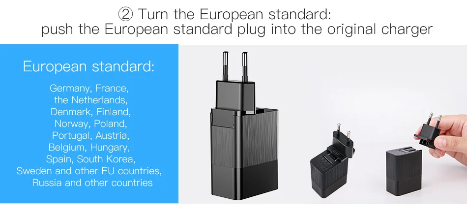 ② Поверните Европейский стандарт: вставьте вилку европейского стандарта в оригинальное зарядное устройство Европейский стандарт: Германия, Франция, Нидерланды, Дания, Финляндия, Норвегия, Польша, Португалия, Австрия, Бельгия, Австрия, Испания, Южная Корея, Швеция и другие страны ЕС, В России и других странах