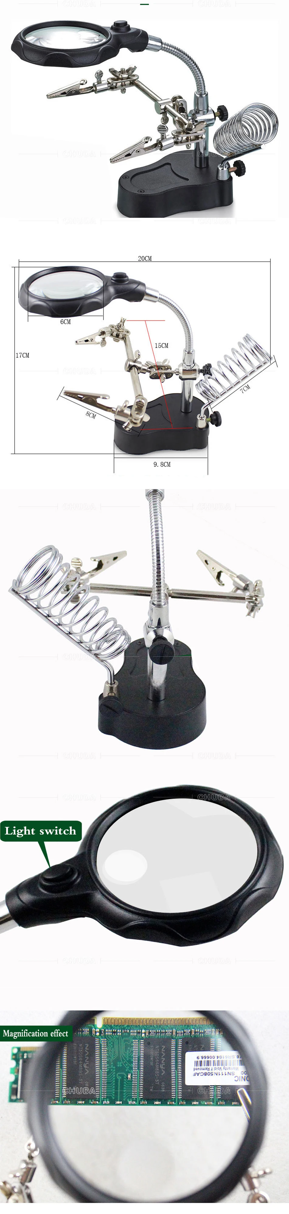 Название продукта (характеристики продукта): осветительное приспособление для ремонта лупы Номер товара: 16126-A Материал изделия: Акриловая линза Название продукта: осветительное приспособление для ремонта лупы Несколько и диаметр: большой объектив 65 мм * 3,5 раз/маленький lens 17 мм * 12 раз Новые функции: с длительным сроком службы светодиодный свет с дополнительным освещением увеличительное стекло имеет частичный re-функция усиления Лупа рука может быть отрегулировано 360 градусов, увеличение: 3,5-12 раз. Часто подходит для ремонта небольших замыканий, может зажимать печатную плату, использовать увеличительное стекло для увеличения рабочей точки для сварки и других операций, не повреждая цепь и простота в эксплуатации. Наиболее практичным моментом является то, что, когда вам нужна третья рука, чтобы помочь вам, эффект этого приспособления может полностью отражать сейчас! Питание: 3 7 AAA батареи (Этот продукт не содержит батареи, батареи нужно купить) Вес: 420 грамм Упаковка: цветная коробка плюс пенная коробка (для обеспечения безопасности транспортировки) Область применения очень широкая, не только используется для ремонта электрических приборов, но также используется для гравировки, идентификации, ручной работы и т. д. Когда вам нужно сделать прекрасную работу, вы можете ущипнуть вещи, стабилизировать и увеличить масштаб через увеличительное стекло. Это хорошее решение. При ремонте электрического прибора вам не нужно брать лупу одной рукой и брать электрический утюг. Подвижная механическая рукоятка, фиксированный зажим и различные части увеличительного стекла можно поворачивать и регулировать в любом направлении. Диаметр увеличительного стекла составляет 60 мм, и есть две пары. Высота проста в наблюдении и обслуживании.