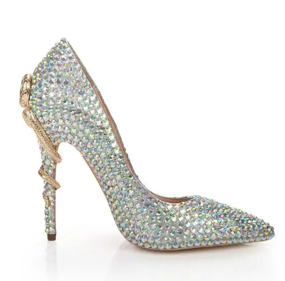 Luxury colorful diamond pointed toe snake stiletto heel wedding bridesmaid shoes...