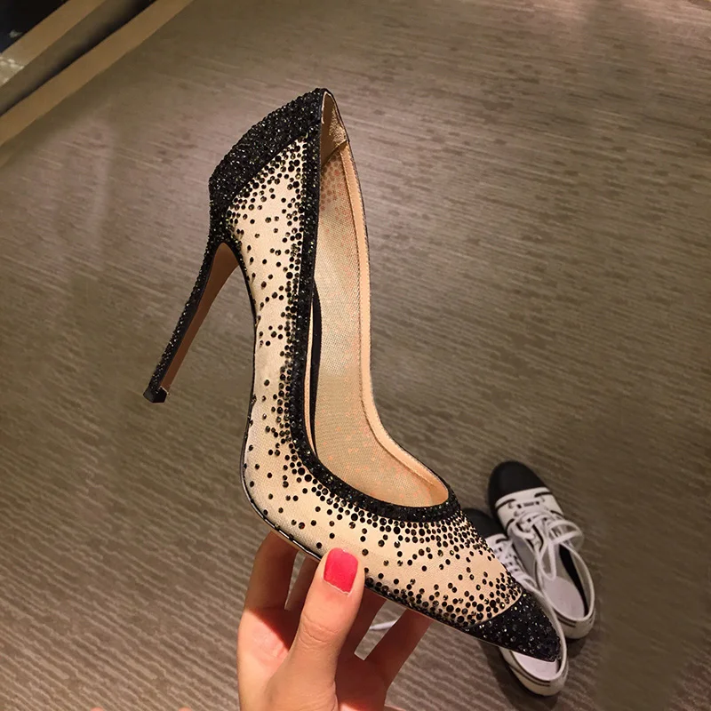 new sexy lace rhinestone high heels black mesh crystal women's shoes