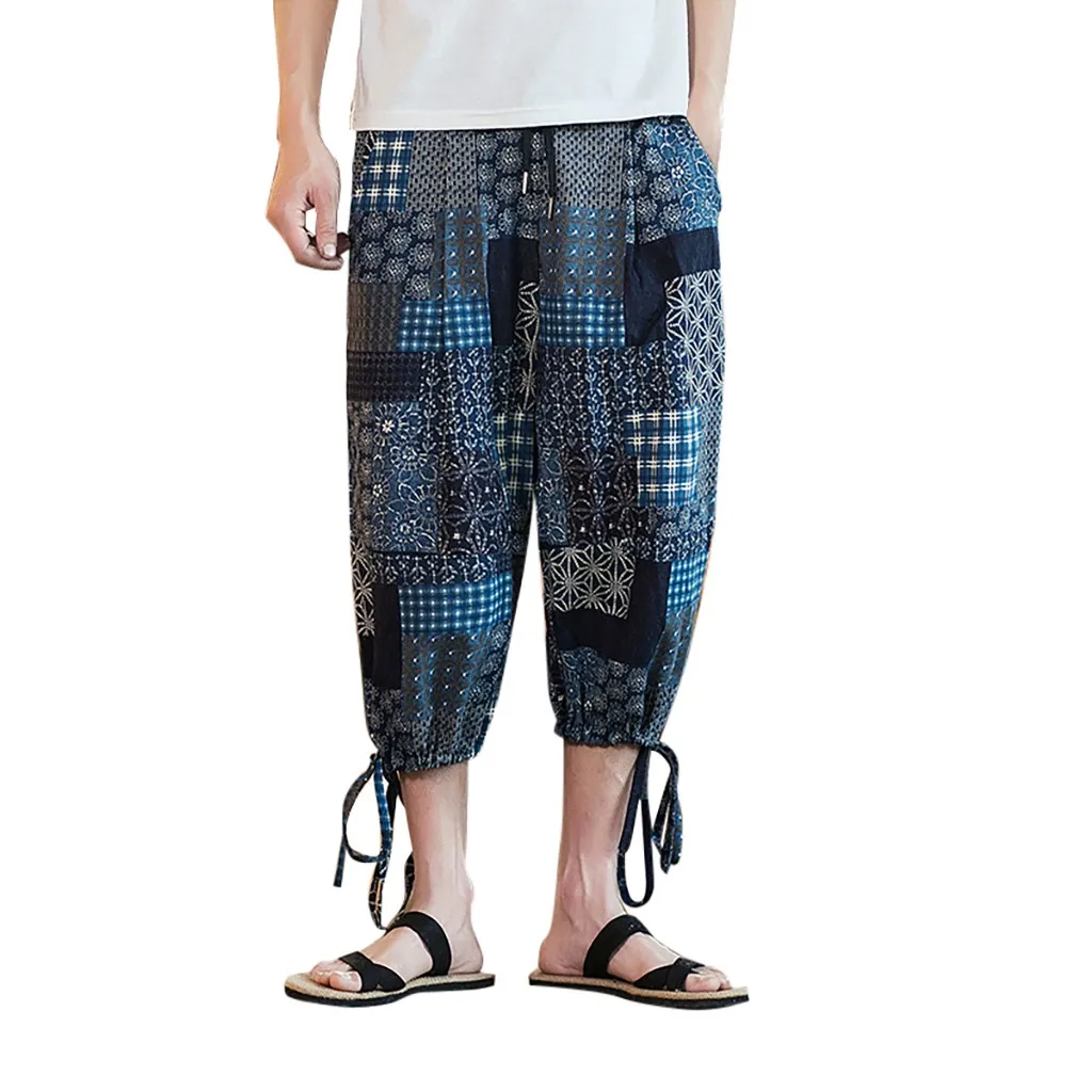 Мужские повседневные тонкие спортивные брюки длиной до икры льняные широкие брюки шаровары