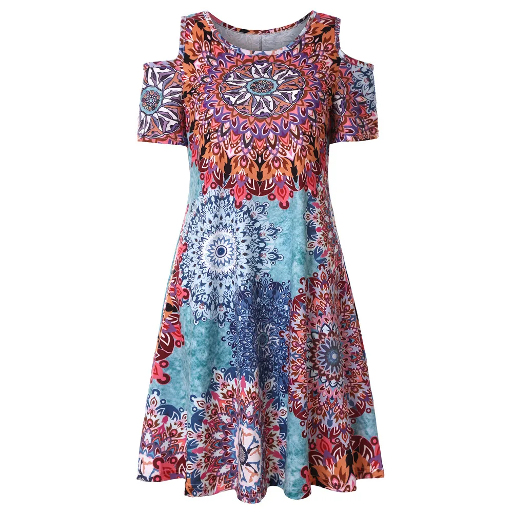 Женское платье, Женский крутой Повседневный Сарафан с открытыми плечами, летнее платье-футболка с карманами, Женская богемная Цветочная Туника пляжное платье