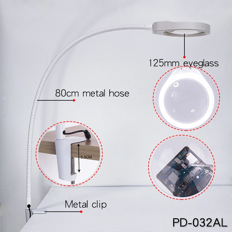 PD-032AL Описание длинная рука Зажимная Лупа Увеличение 10X Apppearance белый Материал линзы Стекло Размер линзы 125 мм Светильник источника 48 шт. светодиодный светильник s Мощность 6-10 Вт Источника питания 100-240Vac 50/60Hz Кабель питания 1,5 м с светильник контроллер коробки Металлический шланг 800 мм H-зажим для зажима 0 ~ 55 мм Продукт Размеры 46*31*6 см Вес изделия 1,9 кг PD-5S Увеличение 3-10X Объектив материал: стекло Размер линзы 100 мм Светильник источника 38 шт. светодиодный светильник s Мощность 6-10 Вт Входное напряжение 100-250 В Току напряжение: DC 12V Длина шнура питания 1,2 м Длина металлического шланга 50 см H-зажим 0-60 мм Внешний вид белый Вес брутто 0,85 кг Размер продукта: 29*19*9 см PD-4S Увеличение 3-10X Объектив материал: стекло Размер линзы 100 мм Светильник источника 38 шт. светодиодный светильник s Мощность 6-10 Вт Входное напряжение 100-250 В Току напряжение: DC 12V Длина шнура питания 1,2 м Длина металлического шланга 36 см Размер металлического основания: 168 мм Головка лампы лупы: 110*130 мм с защитой от пыли Внешний вид черного и белого цвета Вес брутто 1,5 кг Размер продукта: 19*19*23 см PD-032C 1. maginfication лупа: 10X 2. Материал увеличительного объектива: белый 3. Увеличительное стекло эффективный диаметр: 125 мм 4. Оснащен 48 шт. Белый светодиодный ламп, CCT 6000-6500K 5. Яркость освещения: на расстоянии 1 м около 300 люкс. 6. Светильник интенсивность может быть отрегулировать. Мощность Вход 100-220V.Output 12V. Вход Мощность линия 1,5 м. Оснащен регулируемым блоком питания яркости. 7. Длина среднего металлического шланга 260 мм, который может регулировать угол лупы 8. Основной металл mesa 180*280 мм, с четырьмя резиновыми ковриками. 9. Размер головки лампы: 148*166 мм