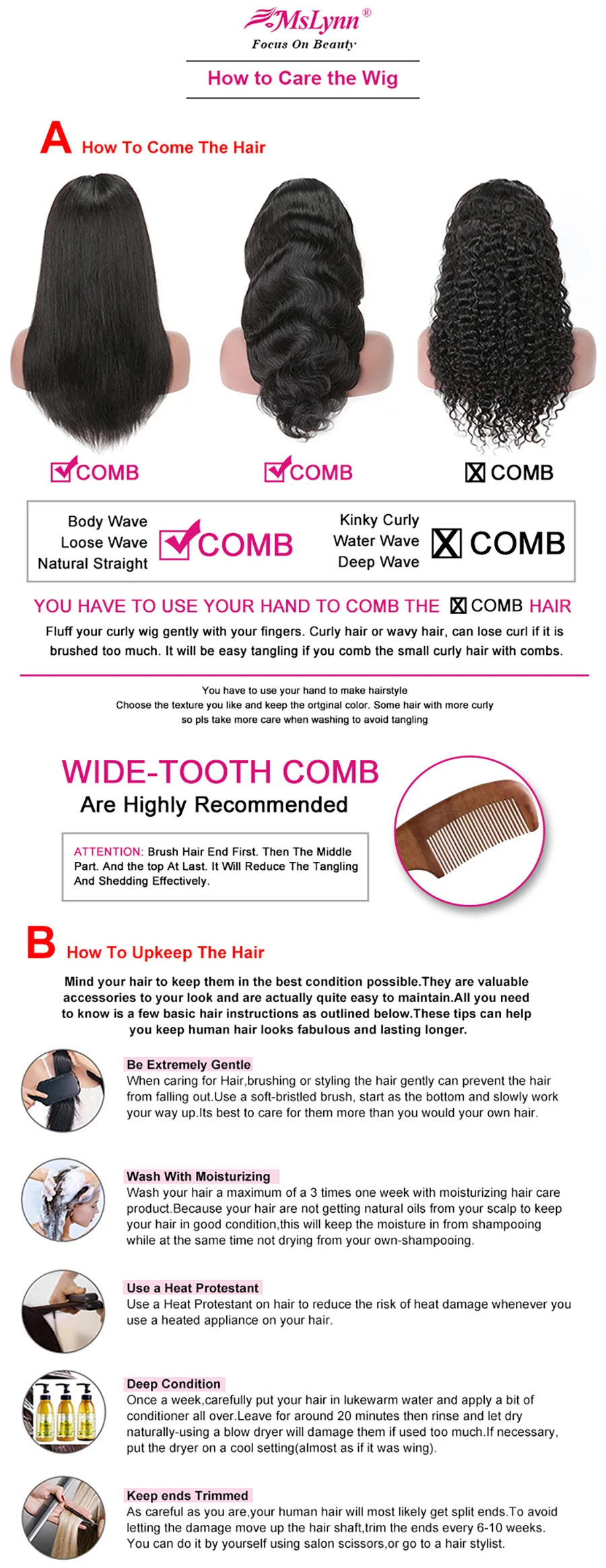 В3: Почему мои волосы линяют? О: пожалуйста, не используйте расческу для расчесывания вьющихся волос, просто мягко бегайте пальцами; Используйте расческу с широкими зубьями для прямой или объемной волны. После мытья, приятно ухаживать за волосами с помощью масла для волос, и волосы будут шелковыми и мягкими.