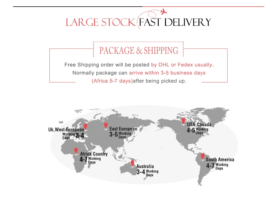 Обычно мы отправляем товар в течение 2 дней после оплаты. Этот короткий волос, способ доставки по умолчанию-это Aliexpress Стандартная доставка, которая не может гарантировать время доставки. Если требуется быстрая доставка, пожалуйста, выберите DHL/Dpex при размещении заказа.