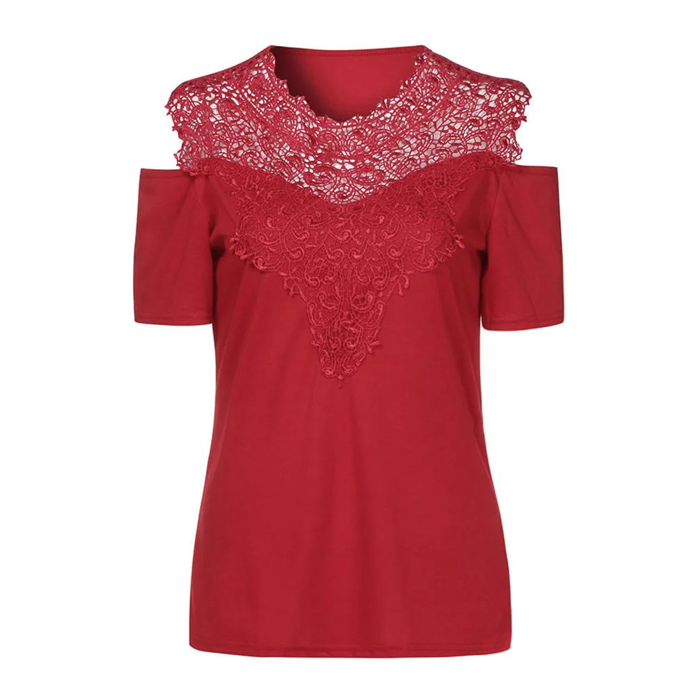 Women Short Sleeve Off Shoulder O-neck Lace Splice Blouse Shirt Tops T-Shirt