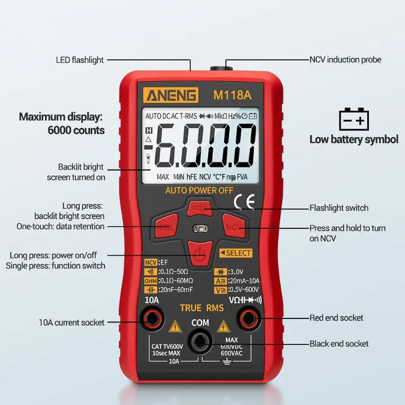 M118A-это 6000 единиц карманного типа, 3 5/6 цифр, истинное эффективное значение, автоматическое сканирование цифрового метра.