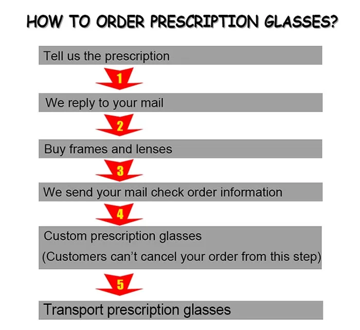 1. Пожалуйста, сообщите нам ваш рецепт и PD (Расстояние зрачка) информацию перед заказом! 2. Выберите правильную рамку и линзы и разместите заказ прямо из нашего магазина. 3. Мы предоставим Вам подтверждение по электронной почте о ваших заказах в течение 24 часов. Пожалуйста, не забудьте проверить наши электронные письма вовремя. 4. Мы начнем обрабатывать ваши линзы по рецепту, если нет проблем. (клиенты не могут отменить ваш заказ с этого шага). 5. Мы сообщим вам номер отслеживания после отправки.