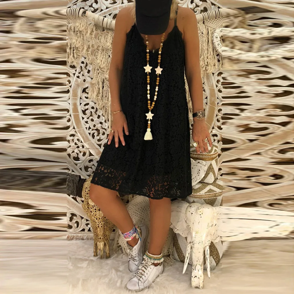 Женская Летнее однотонное Повседневное платье без рукавов с v-образным вырезом; свободное кружевное платье большого размера