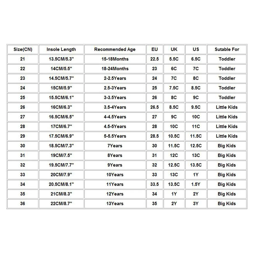 | Размер (CN): 21 | Длина стельки: 13,5 см/5,3 дюйма | Рекомендованный возраст; ширина: 15-18Months | ЕС: 22,5 | Великобритания: 5.5C | Свяжитесь с нами: 6.5C | Удобен для: для детей ясельного возраста |
