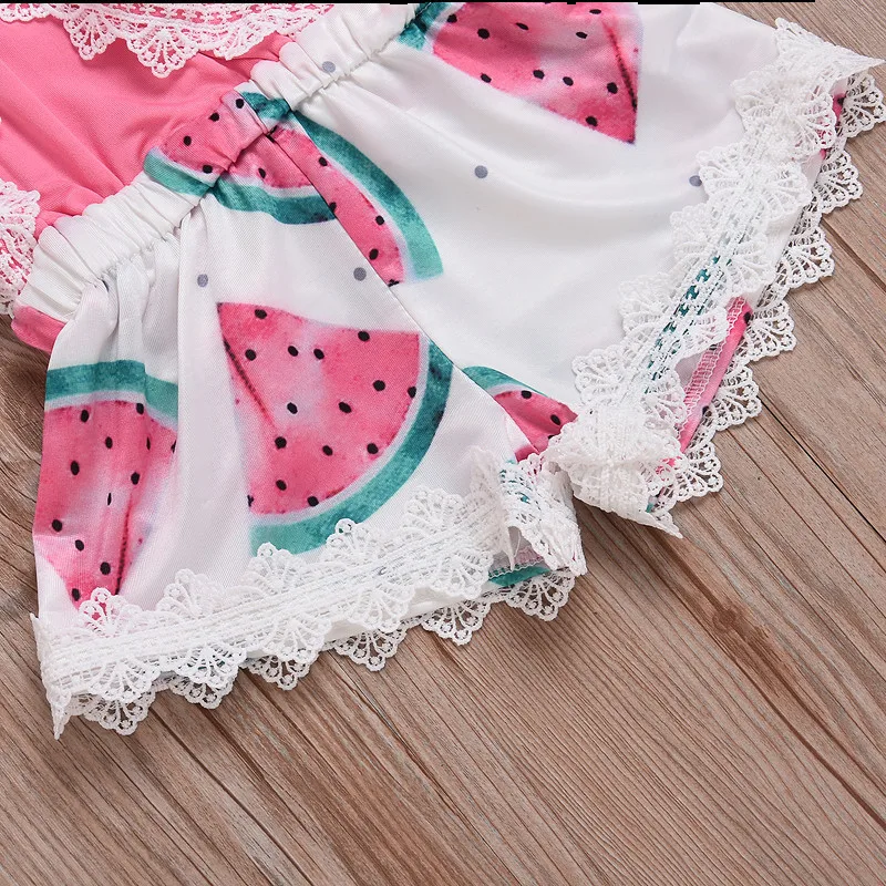 Летняя одежда для маленьких девочек с фруктовым арбузом, милый розовый комбинезон с открытой спиной и поясом, кружевной комбинезон с v-образным вырезом, Модный комбинезон для детей 0-4 лет