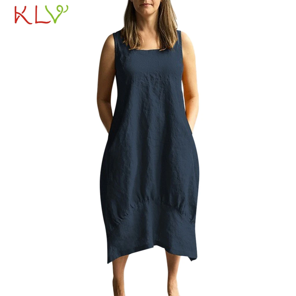Женское повседневное однотонное платье без рукавов с круглым вырезом, свободное льняное платье с карманами