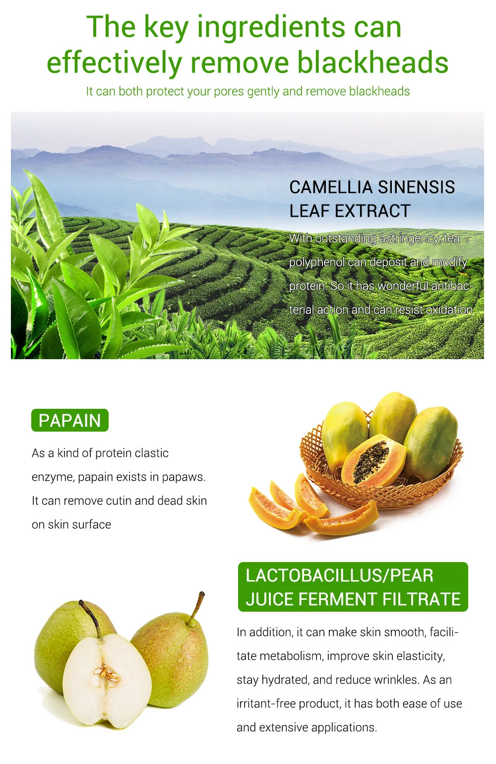 Ключевые ингредиенты могут эффективно удалять угри, они могут защитить ваши поры мягко и удалить угри CAMELLIA SINENSIS экстракт листьев с выдающейся астрактностью, чай полифенол может депонировать и модифицировать белок. Таким образом, он обладает чудесным антибактериальным действием и может противостоять окислению папаина как своего рода белкового клетчатого фермента, папаин существует в papaws. Он может удалить кутин и омертвевшую кожу на поверхности кожи лактобацилл/грушевый сок фермент Кроме того, он может сделать кожу гладкой, облегчить обмен веществ, улучшить эластичность кожи, оставаться увлажненной и уменьшить морщины. Как раздражающий продукт, он имеет как простоту использования, так и широкое применение.