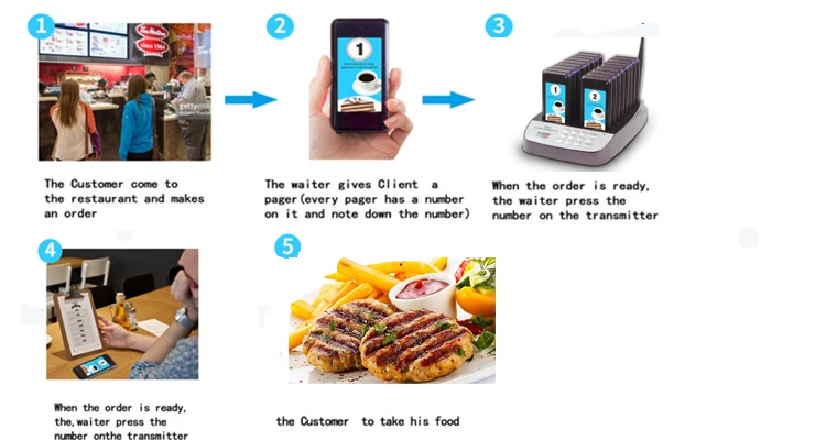 Набор беспроводных гостевых пейджинговых систем queue состоит из одной 999-канальной клавиатуры, беспроводной кнопки вызова и 16 беспроводных пейджеров. Он использует технологию радиочастотного беспроводного и обучающего кода, может легко соединять до 999 каналов пейджеров. В то время как клиент размещает заказ, он (она) будет отправлен один приемник с номером, когда заказ будет готов, нажмите на клавиатуру, чтобы позвонить по номеру, клиент получит его через звуковой сигнал/вибрацию/светодиодный индикатор. Система очереди значительно повышает эффективность работы и позволяет избежать ожидания клиента в длинной очереди. Таким образом, он широко используется в фаст-фуде, фуд корте, клинике, церкви и автомагазине или других случаях очереди.