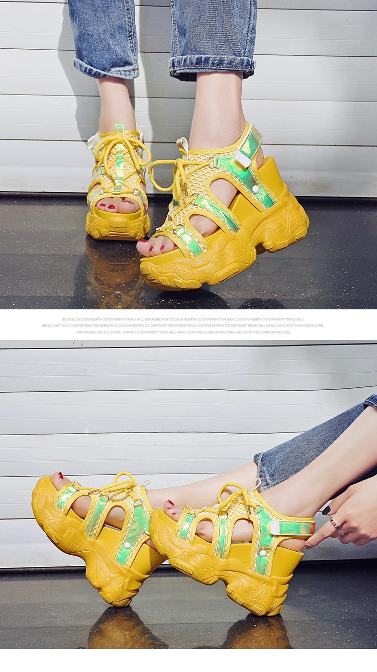 Новинка 2019 года; Летние Блестящие Босоножки на платформе; женские удобные сандалии на высоком каблуке; кроссовки на танкетке 11,5 см; пляжные шлепанцы на толстой подошве