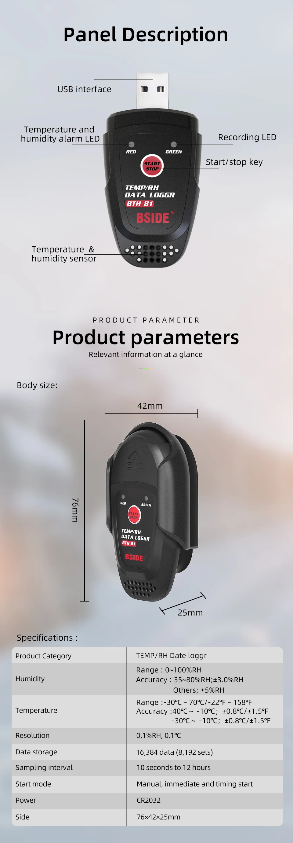 Диапазон измерения температуры: -40 ℃-70 ℃/-40 ℉-158 ℉, разрешение: 0,1 ℃; Диапазон измерения влажности: 0%-100%, разрешение: 0.1%. Регистратор данных до 16384 показаний.