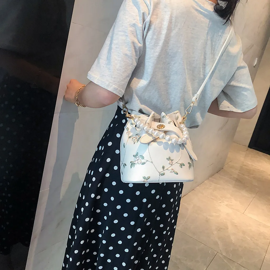 Женская жемчужная кожаная сумка через плечо с цветочной вышивкой, пляжная сумка-мессенджер с цепочкой