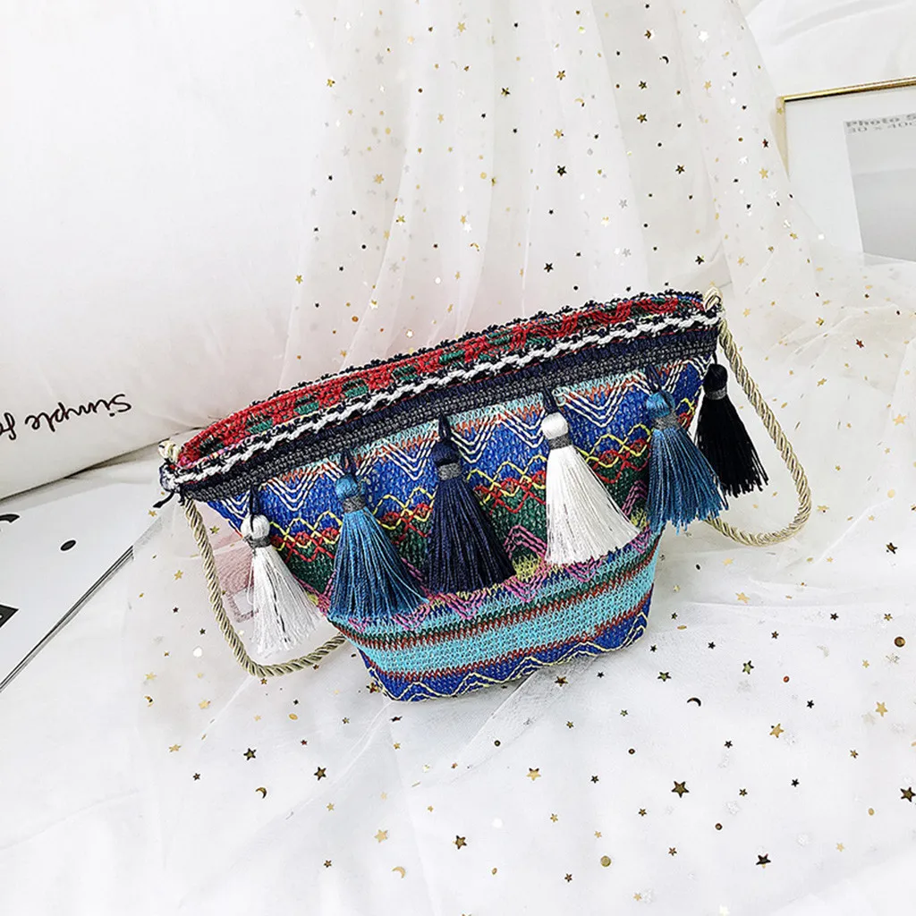Соломенная Сумка в этническом стиле с лентами и кисточками, пляжная сумка, сумка-мессенджер