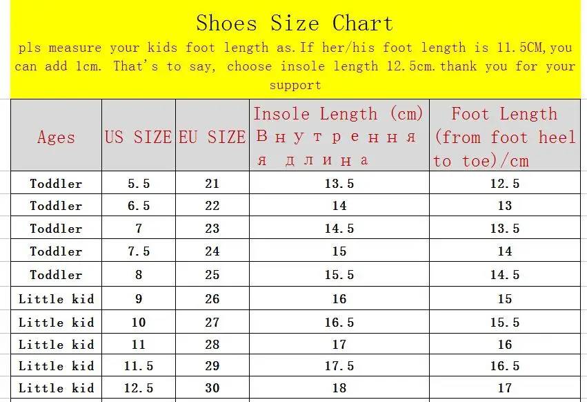 Дорогие друзья! Поскольку все размеры детской обуви отличаются, при заказе детской обуви вы должны соответствовать нашим размерам и внутренней длине. Согласно длине стельки. (длина стельки = длина стопы + 1 см) Американский размер не стандартный, просто удобный для вас, чтобы сделать заказ. Удобная длина-это длина стопы, добавляющая около 1 см. И из-за длительного времени доставки Авиапочта Китая и ребенка быстро вырастет, пожалуйста, выберите обувь большего размера для вашего ребенка Пожалуйста, выберите правильный размер.