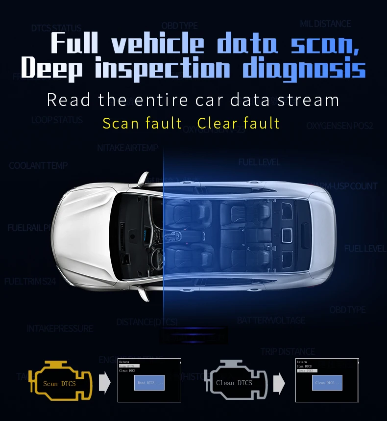 • Богатое содержание:Скорость транспортного средства, об/мин двигателя, температура воды, перегрев масла, давление впуска, напряжение, мгновенный расход топлива, средний расход топлива, измерение расстояния вождения, вождение Время, Сигнализация низкого напряжения, сигнализация с высокой температурой воды, сигнализация с превышением скорости, сигнализация с кодом неисправности двигателя, устранение кода неисправности, свободное переключение между километрами и Майлс