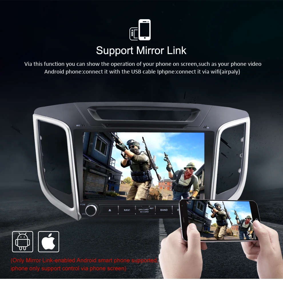 Поддержка функции зеркального соединения позволяет dvd discreen отображать то же изображение или видео на экране ваших смартфонов (требуется O.S. Android 4,0 +, iOS 7,0 +).