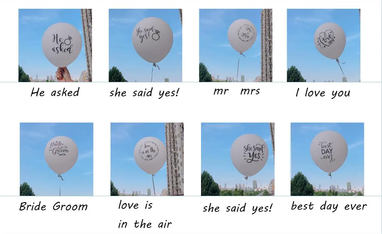 В упаковке15Воздушные шары • 10 дюймов в диаметре, возможна небольшая погрешность • Подходит как для воздуха, так и для гелия. • Воздушный шар классификация: 1 --- лучший день когда-либо 2 --- она сказала да (1) 3 --- она сказала да (2) 4 --- спросил 5 --- Любовь в воздухе 6 --- невеста будет 7 --- подача заявки в виде жениха и невесты 8 --- я люблю тебя 9 --- Mr. Mrs. Дорогой друг, на самом деле буквы на воздушном шаре будут легче, чем на фотографии. Но если вы используете их для фотографий, эффект такой же. Если вы возражаете, вы можете выбрать другой продукт (наклейка для воздушного шара). Любые другие украшения не включены в продажу.