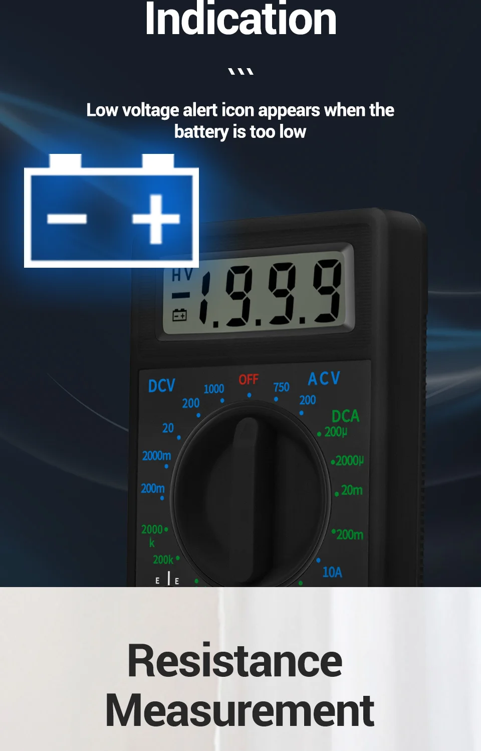 3 знака после запятой, 7-сегментный, 0,5 "Высокая ЖК-дисплей Дисплей Max Дисплей: 1999, автоматический дисплей полярности небольшой и компактный дизайн защита от перегрузки на всех диапазонах выборки 2 ~ 3 раза показания в секунду тест на сборку диодов/транзистор P-N тест на соединение/Транзистор hFE Тест индикация низкого напряжения батареи