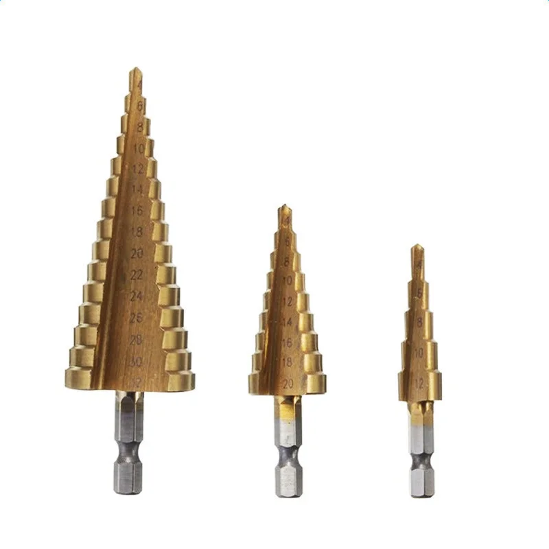 Это новая быстрорежущая сталь с большим шаговым Конусным сверлом, титановый набор сверл, который сделан из высококачественной быстрорежущей стали и с титановым покрытием, чтобы уменьшить трение и тепло
