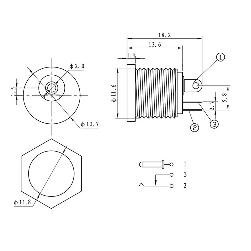 Pin Diameter: 2.1mm/0.08"