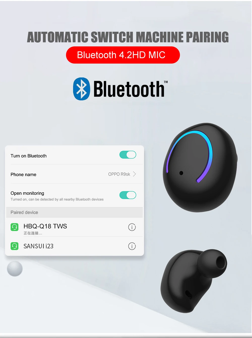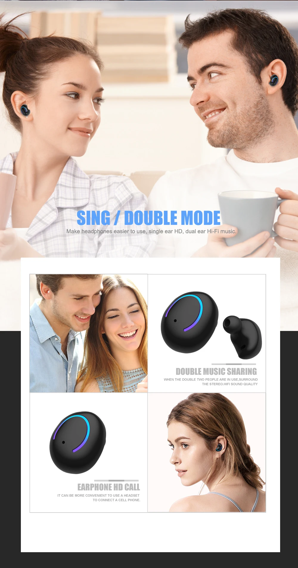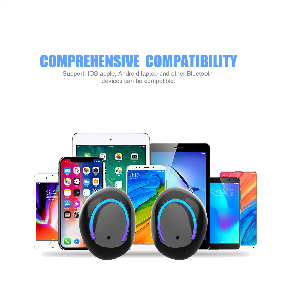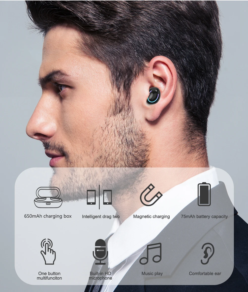 1. Параметры гарнитуры Версия Bluetooth: V5.0 + EDR Беспроводной частота: 2,4 ГГц Вспомогательное соглашение: A2DP1.3/HFP1.6/HSP1.2/AVRCP1.6/D11.3 Расстояние передачи: 10 метров Емкость аккумулятора: 75 мАч Напряжение/ток зарядки: 5 В/1 А Время воспроизведения/разговора: 8-9 часов Время зарядки: 1-2 часа Время работы в режиме ожидания: 200 часов Сопротивление динамика: 327мм 32Ω Чувствительность микрофона: -42 дБ Рабочая температура: -10-50 °C Вес брутто: 5 г * 2 2. Параметры зарядного устройства Входное напряжение/ток: 5 В/1 А Емкость аккумулятора: 650 мАч Вес брутто: 42 г 4. Список товаров Наушники * 2, Зарядный отсек * 1, Зарядный кабель * 1, Ушные шапки * 4, Руководство * 1