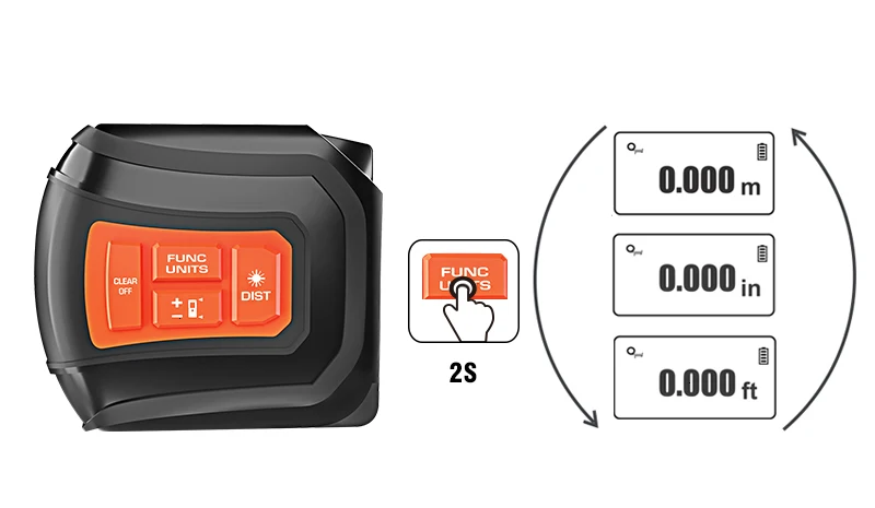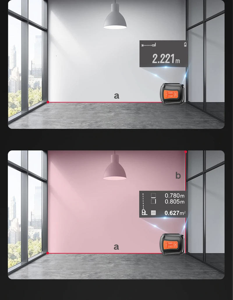 Экономия времени! Измерьте два боковых расстояния одновременно!Вы можете измерить расстояние одной стороны с помощью лазера и другой стороны с помощью ленты одновременно, вы можете получить общую длину для двух сторон на дисплее в течение 2 секунд!
