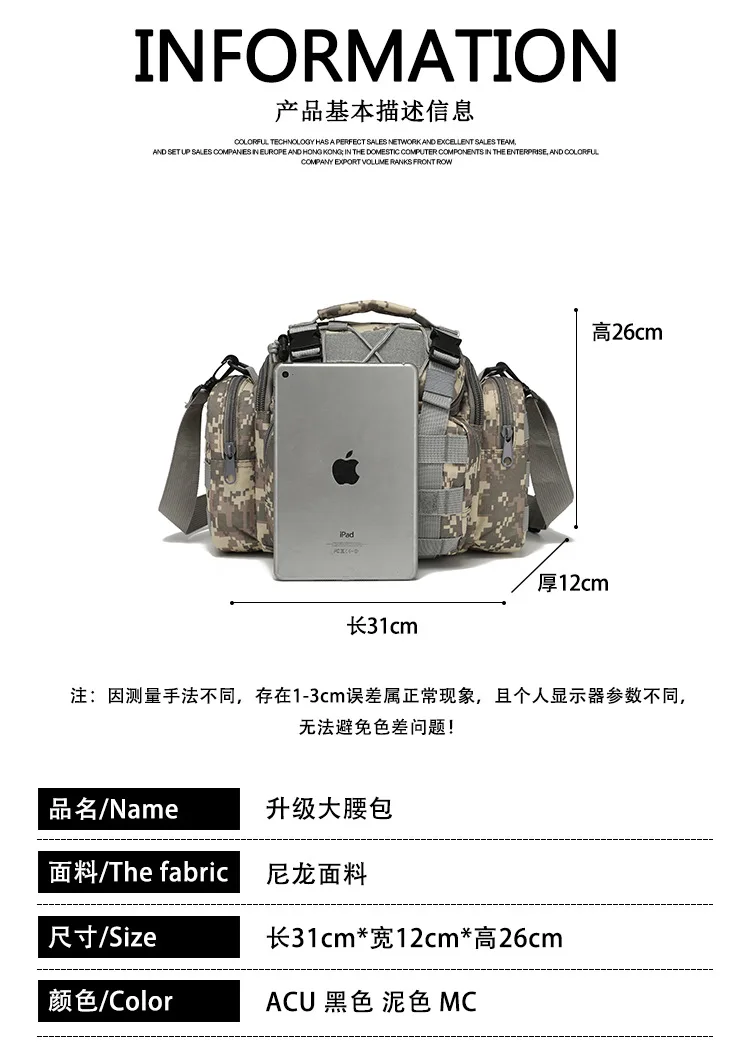 Емкость: 10-12L Размер изделия (Длина x Ширина x высота) :31x12x26cm Вес упаковки: 0,775 кг Содержание пакета: 1 x Тактический Водонепроницаемый карманов Примечания: 1: В связи с тем, что измерения выполнены вручную, замеры сделаны вручную, поэтому возможны отличия в 1-2 см (0,4-0,8 "), спасибо 2: реальный цвет изделия, показанные на фото может немного отличаться на мониторе компьютера, поскольку мониторы не выровняется одной и той же