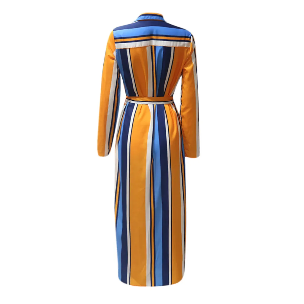 Женское платье-рубашка с длинными рукавами и завязкой на талии в Вертикальную Полоску