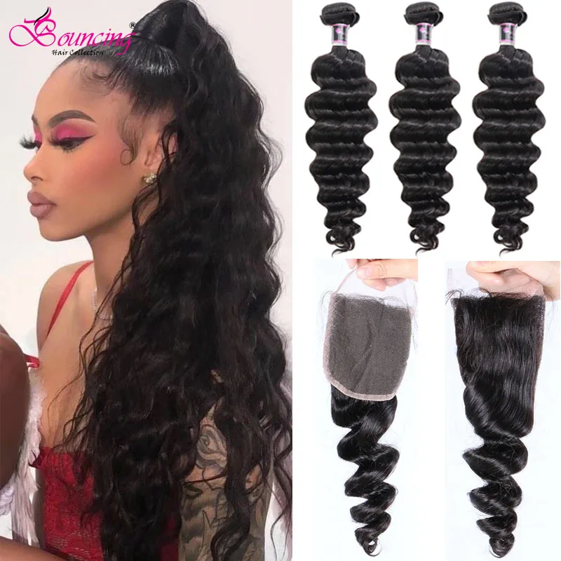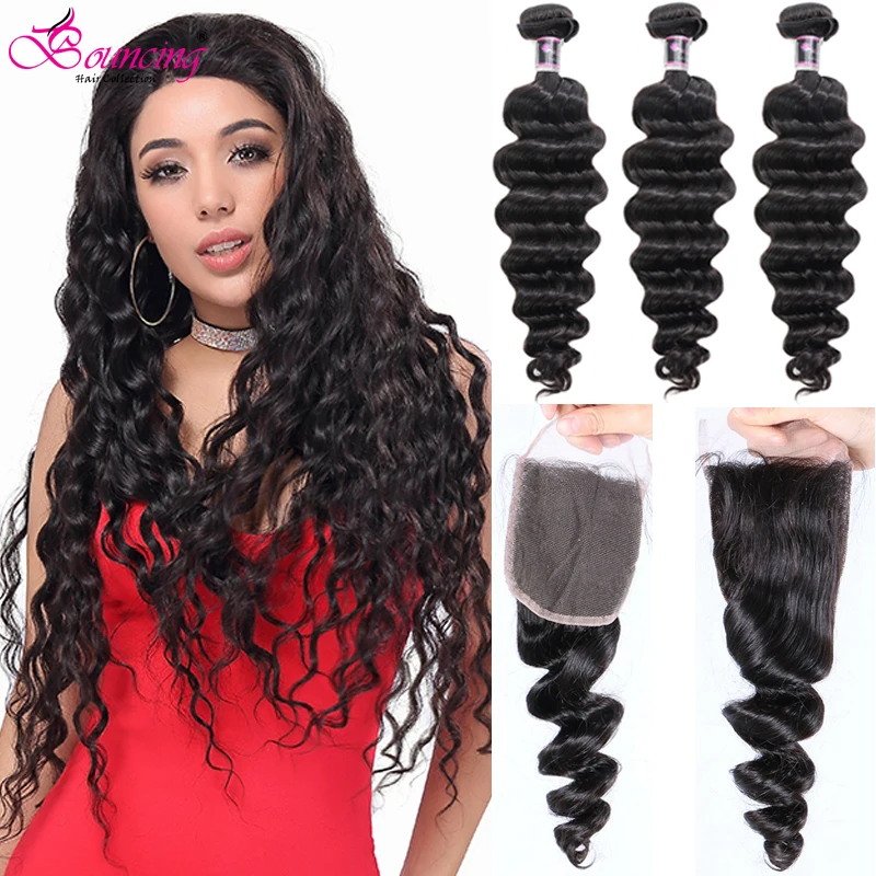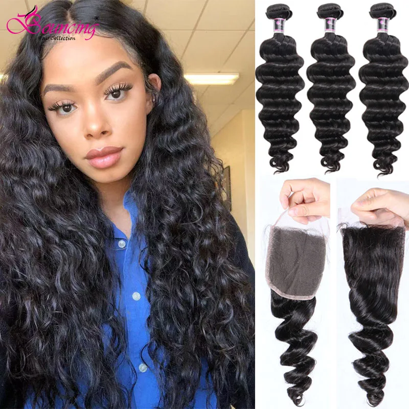 Волнистые свободные волнистые волосы, пучки с закрытием, бразильские человеческие волосы, плетение с закрытием, пучки с кружевами, накладные волосы