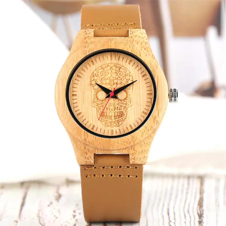 Простой дизайн: бамбуковые часы разработаны с простым циферблатом с изображением черепа и устойчивым к царапинам минеральным стеклом и коричневым ремешком для часов с пряжкой на крючке, что удобно и стильно для ношения.