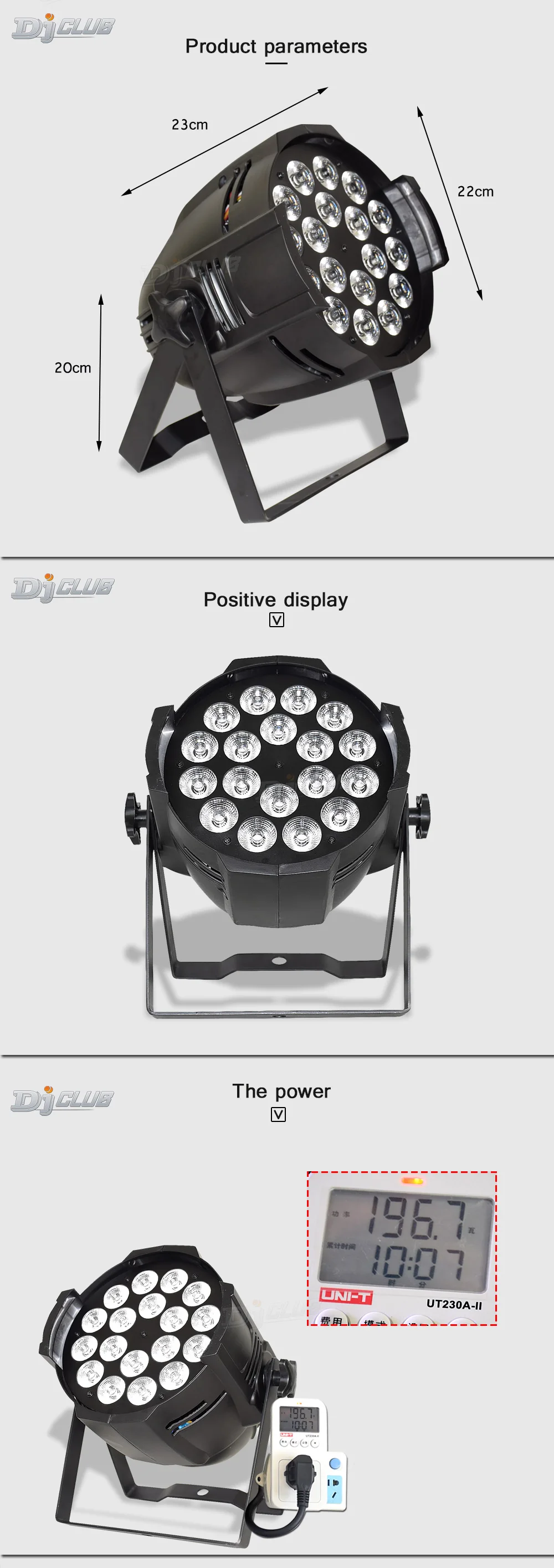 -Ультра яркий тонкий светильник с 18x 12 Вт QUAD светодиодов (4 в 1 RGBW-красный, зеленый, синий и белый) -Отлично подходит для сцены, где традиционные par Банки выделяют много тепла на выступления -Низкопрофильный дизайн корпуса -8 режимов канала DMX: 8 режимов канала -6 режимов работы: ручной режим цвета; Режим изменения цвета; Режим выцветания цвета; Автоматический режим (Запуск программы); Режим активного звука и режим DMX-512 -Плавное смешивание цветов RGBA (быстрое или медленное изменение цвета) -QUAD LED (4-в-1) проектов без RGB тени для век -15 встроенных цветных макросов -Цвет мерцающий эффект -Без мерцания -Электронное Затемнение: 0 - 100% -Угол луча: 45 градусов -Соединчющаяся между собой через 3-pin кабеля (вход/выход) -С 4 кнопками СИД DMX светодиодный дисплей на задней панели -Двойной кронштейн хомут позволяет подвешивать или устанавливать на земле -Работает всю ночь-без рабочего цикла -Длительный срок службы светодиода (50000 часа). -Мощность: 190 Вт Макс -Мульти-Рабочее напряжение: AC 100-240 В пер. тока, 50/60 Гц Размеры (Д x Ш x В): 21,5x23x22 см -Вес: 3,2 кг.