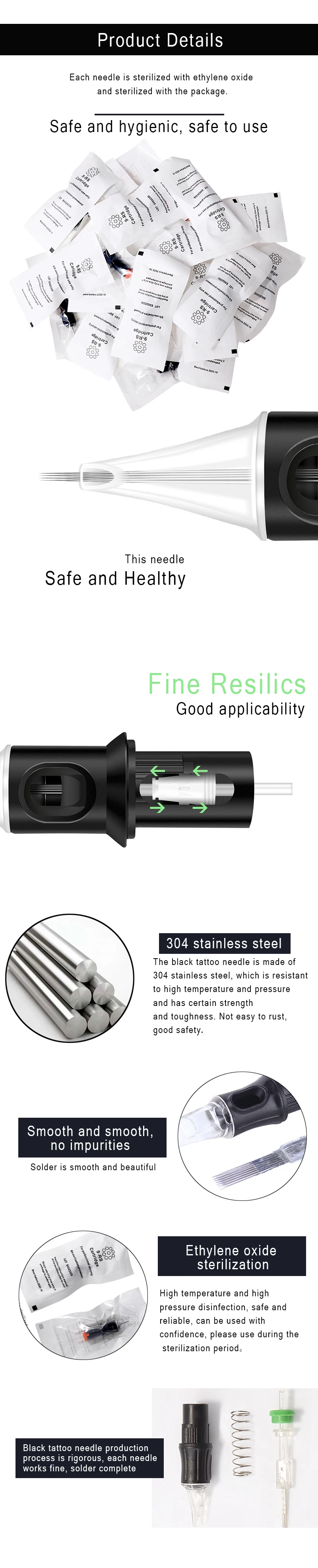 1.The cartridge tattoo needle is made of 316 medical stainless steel and 100% E.O. sterilized and packaged in blister pack.