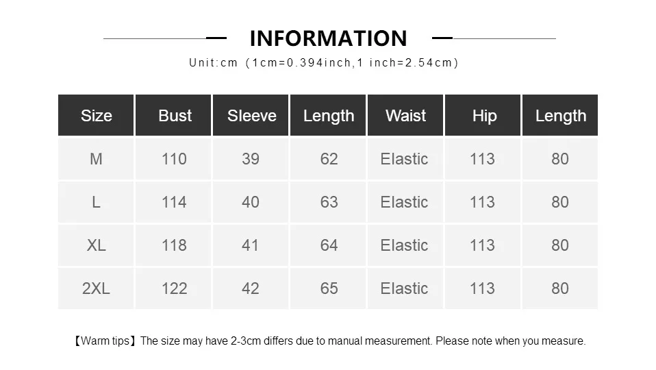 M: обхват груди 110 см, ширина плеч 39 см, длина 62 см, талия эластичная, обхват бедер 113 см, длина 80 см, L: обхват груди 114 см, ширина плеч 40 см, длина 63 см, талия эластичная, обхват бедер 113 см, длина 80 см, XL: обхват груди 118 см, ширина плеч 41 см, длина 64 см, талия эластичная, обхват бедер 113 см, длина 80 см, XXL: обхват груди 122 см, ширина плеч 42 см, длина 65 см, талия эластичная, обхват бедер 113 см, длина 80 см, О Размеры: 1: измерения выполнены вручную, поэтому возможны расхождения в 2-3 см в связи с тем, что измерения выполнены вручную.(1 дюйм = 2,54 см; 1 см = 0,39 дюймов). 2. Пожалуйста, внимательно сверьтесь с таблицей размеров, прежде чем купить товар. Если вы не знаете, как выбрать размер, пожалуйста, свяжитесь с нашей службой поддержки клиентов. 3. Выберите больший размер, если ваш размер находится между двумя размерами. О Цвет: Как известно, цвета на мониторе вашего компьютера могут немного отличаться от реальных цветов продукта в зависимости от настроек вашего монитора. Спасибо!